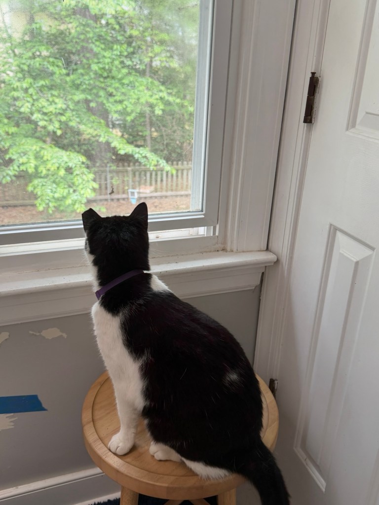 Sylvester loves looking out the window. I’ve slid in a random end table into the bathroom so he has a window seat as we wait for the condo to get here…..
