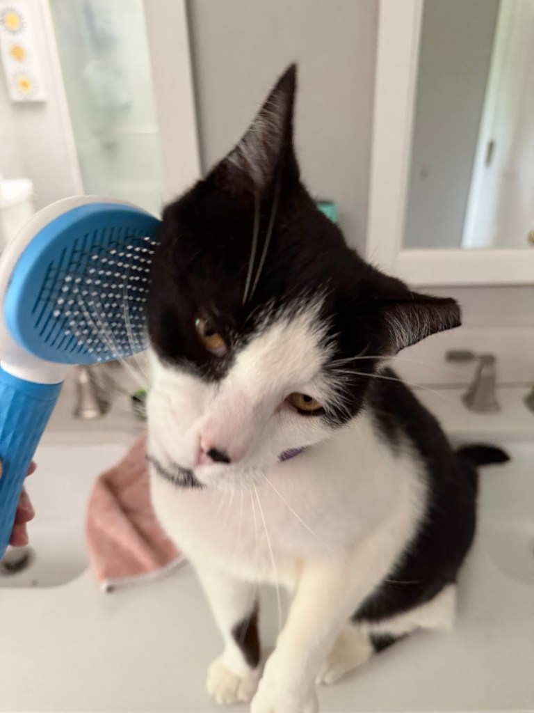 His brush arrived Monday. I call it the “brush of magic”. It’s actually a fairly cheap brush off Amazon. I keep having to order new brushes as foster cats fall in love with their brush and I pass it along to their forever family.